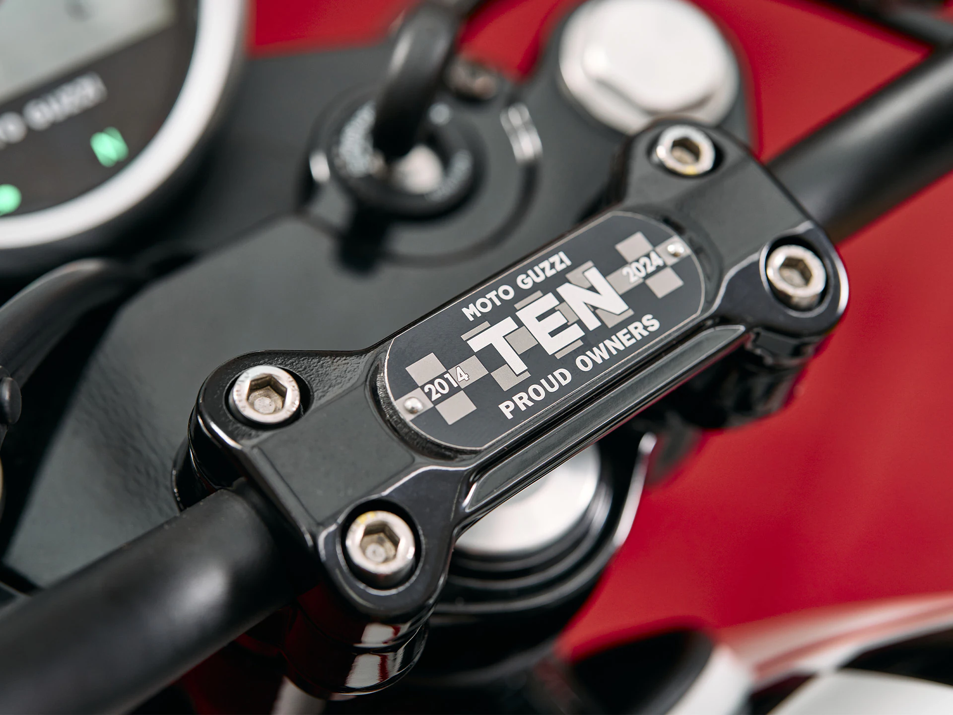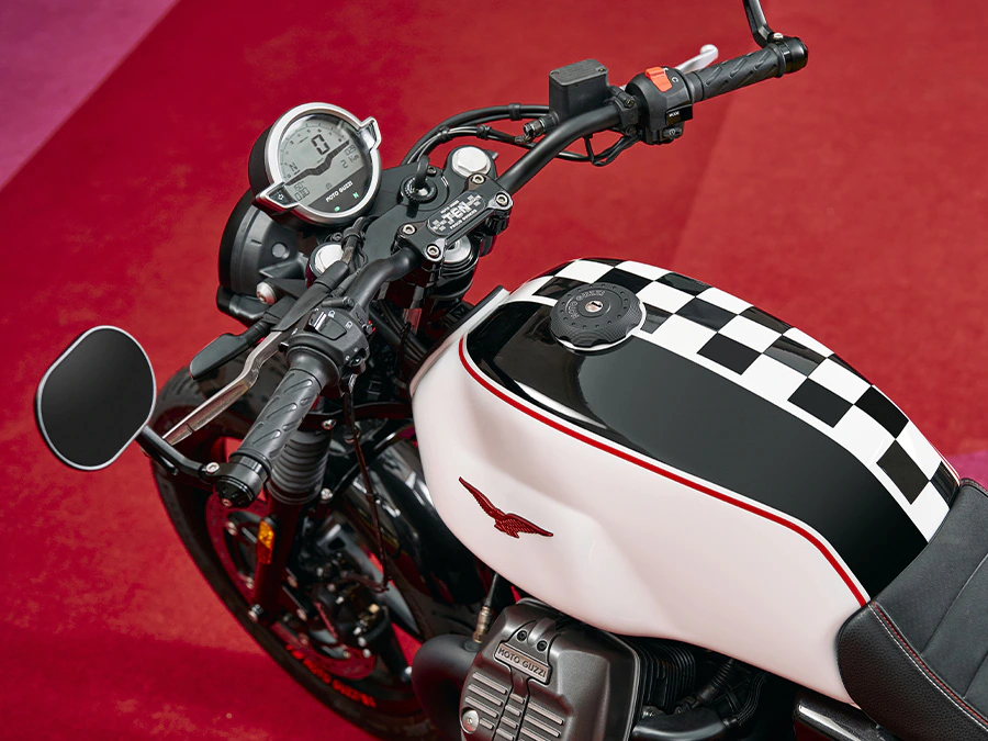 La decoración especial del V7 Stone Ten recuerda el logotipo de The Clan con una banda a cuadros en blanco y negro con bordes rojos, un elemento que recorre la parte superior del tanque a lo largo de la superficie pintada de negro. También son rojos los detalles como las costuras en el sillín, los muelles de los amortiguadores, el águila en el depósito y la inscripción Moto Guzzi en el canal de ambas llantas. Junto con la placa dedicada en el elevador del manillar, subrayan el carácter exclusivo de esta configuración, firmando su fuerte identidad.